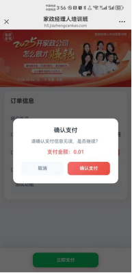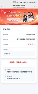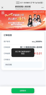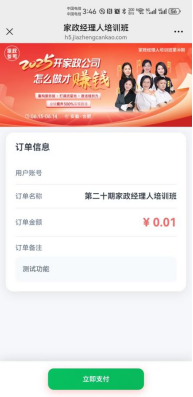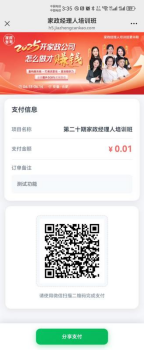① 点击对应的培训班进入详情页,输入金额、订单备注(可不填,不填后续页面不展示)生成预支付订单;