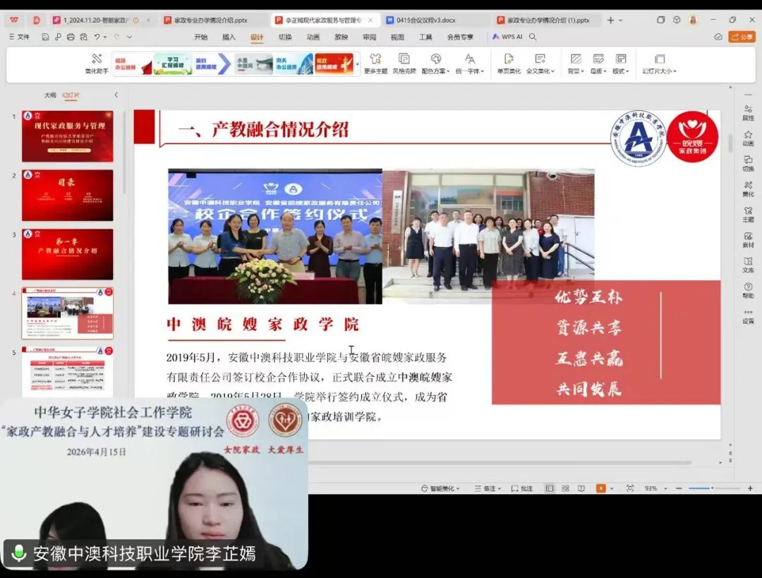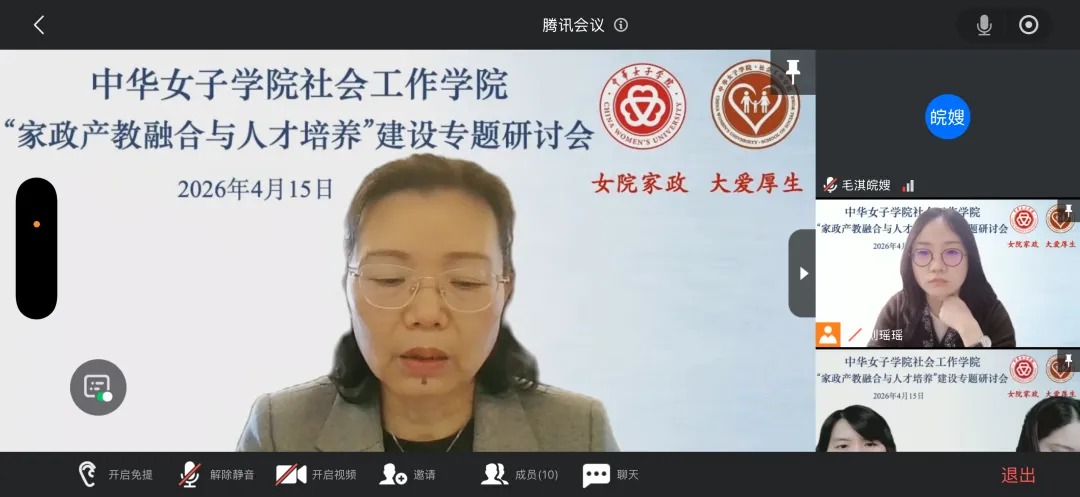 为深入贯彻落实国家关于促进家政服务业提质扩容的决策部署,积极探索家政产教融合新路径,推动家政人才培养高质量发展,2026年4月15日上午,由中华女子学院社会工作学院牵头,安徽中澳科技职业学院与安徽皖嫂家政集团共同参与的“家政产教融合与人才培养”专题研讨会以线上形式顺利召开。本次研讨会主要是围绕着新时代家政学人才培养经验与特色以及家政产教融合发展路径与未来规划,会议由中华女子学院社会工作学院副院长李芳英主持。